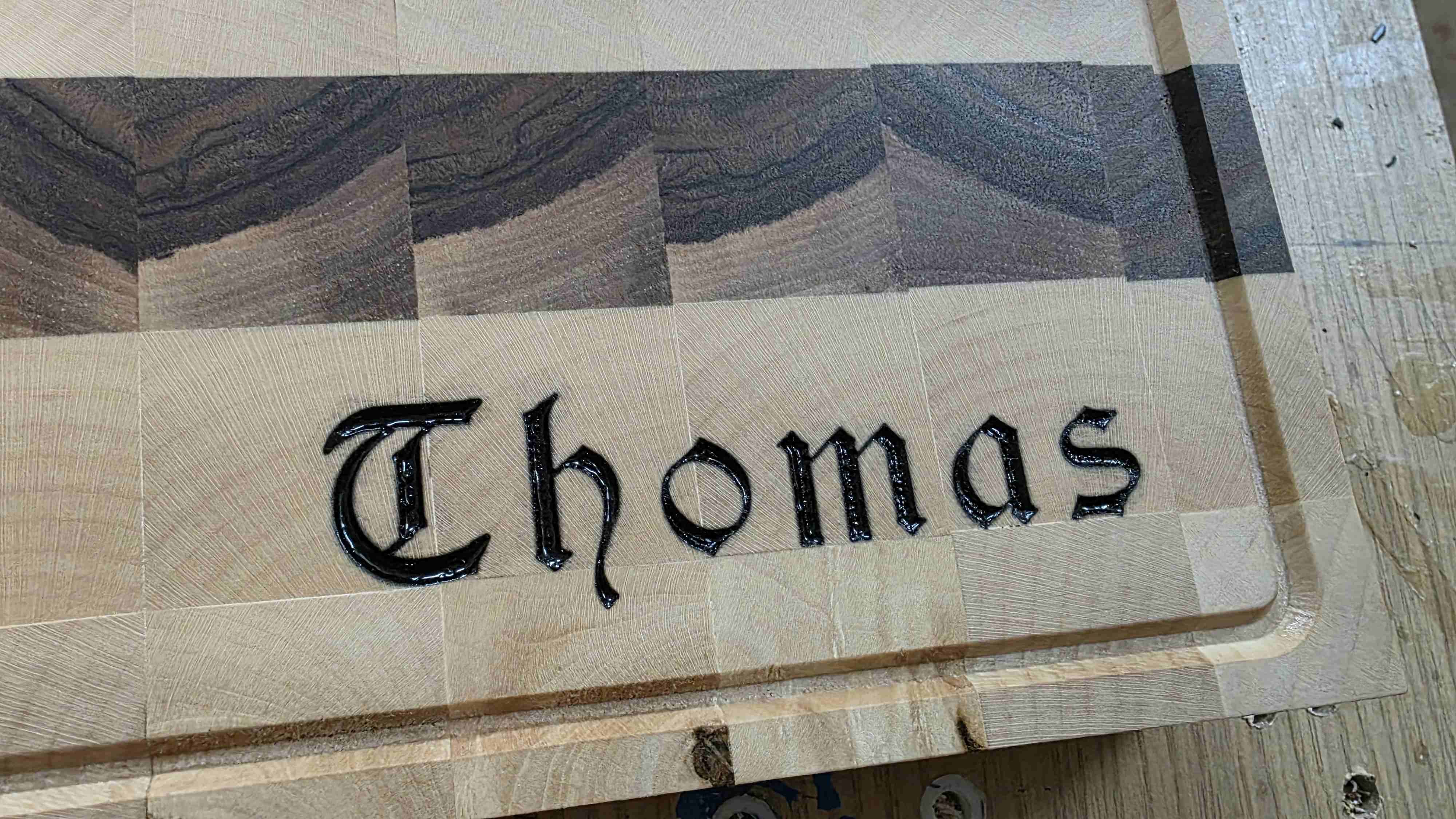 Eine Namensgravur in einem Jausenbrett gefüllt mit gehärteten Wachs um den Kontrast zu erhöhen.